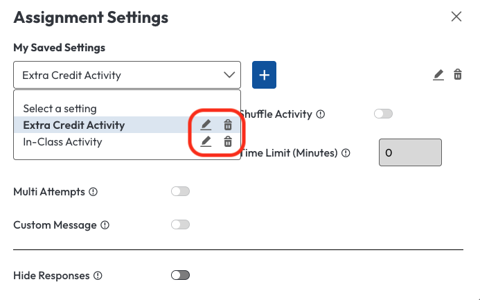 To delete a preset, select it in the dropdown menu and click the trash icon. If the deleted preset was previously used in assignments, those assignments will retain their existing settings. However, they will no longer be linked to a preset.