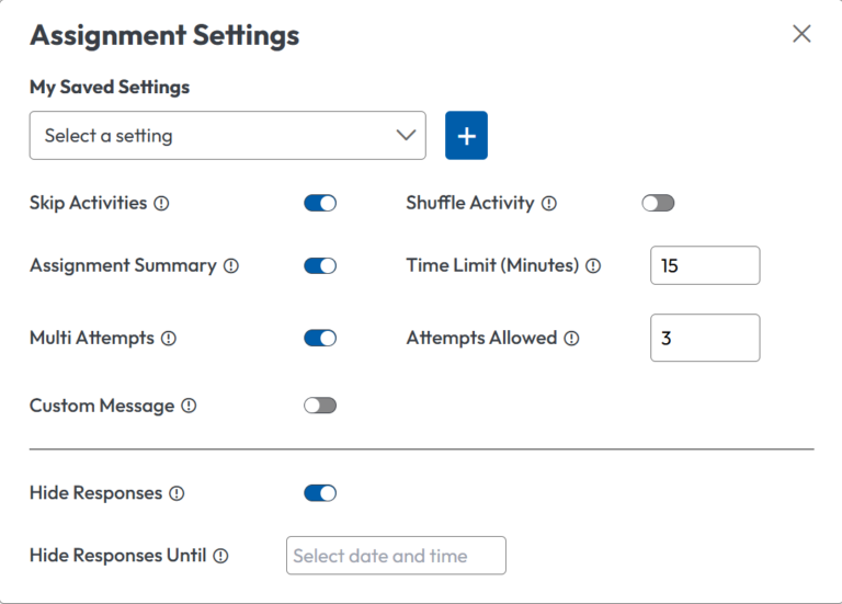 When creating a graded assignment from anywhere within The KWL Hub, teachers accessing the settings panel will now see a dropdown menu titled “My Saved Settings”.